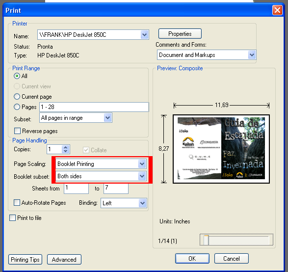 Criei este guia com a intenção de ser “auto-imprimivel”, ou seja, quem quiser ir pra invernada basta baixar o guia e imprimi-lo. Para isto, basta escolher a opção “Booklet printing” na hora de mandar imprimir (vide foto anexa). Ele irá imprimir em formato de A5, ficando duas páginas na frente da folha de sulfite (e 2 no verso). Se sua impressora não imprime frente verso, então é só mandar imprimir as frentes primeiro, e depois as costas. Claro que a ordem das folhas da impressao na primeira vez (frente) deve ser a mesma na segunda (costas) também! Desta forma quando tiver imprimido (impresso?) tudo, vai ser só dobrar no meio e “Voilà”, tens um livreto de escalada! Muito simples! Recomendo imprimir colorido pois há muitas fotos das vias e do local, então para melhor visualizaçao e desfrute deste guia, as cores podem ser essenciais. (não que o P&B não sirva, mas o colorido fica muito melhor!!).