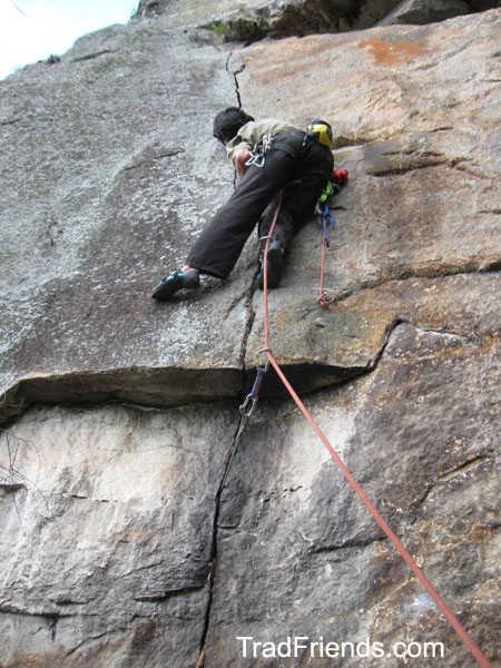 Entre acertos e erros (muito mais erros) nas trilhas, chegamos aos pés das paredes, procurando as vias que existem nesse lugar. Caminhando um pouco em um corredor, encontramos uma corda que acessa a parte superior do Cânion e, bem ao lado, uma fissura perfeita de dedos, escondida entre cipós e espinhos. Com um pouco de esforço chegamos embaixo da fenda e ficamos angustiados por não trazer nenhum tipo de material de conquista, como também equipamento móvel. Então o Jonatt tem a idéia de conquistar a via utilizando como material de proteção nas fendas nós de cordelete e fitas, como os alemães e tchecos fazem no vale de Elba. Uma coisa que não sabíamos e tivemos que aprender da pior maneira é a dificuldade de se entalar esse tipo de proteção nas fendas: depois de colocadas elas parecem muito sólidas, porém com alguns puxões as capas dos cordeletes se rompem e as proteções sacam. Outra coisa importante é o tipo de nó utilizado, ele é essencial para que a proteção fique razoável (se é que essa palavra pode ser utilizada).
