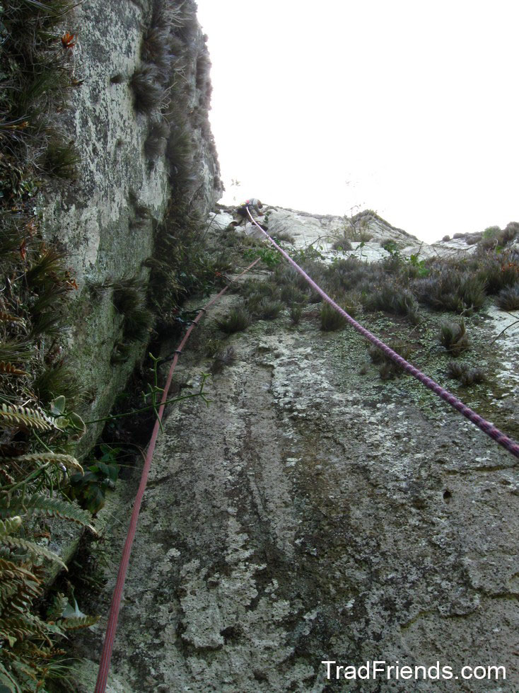 Quando cheguei a parada o Elcio me falou para tomar cuidado pois as peças da reunião eram duvidosas. Comecei a escalar e já no início coloquei um stopper para quebrar o fator de queda. Subi mais um pouco colocando algumas proteções, a maior parte duvidosa. Como a parede estava muito suja decidi parar em uma peça que pareceu sólida quando, com o mínimo puxão ela sacou em minhas mãos e saí voando. Caí uns 8 metros, 4 metros abaixo do Elcio e percebi que ele olhava assustado para a parada. Na queda haviam sacado 3 friends e o pequeno stopper havia evitado o fator 2. Subi para a parada com muito cuidado e recomecei a guiar. Sem possibilidade (ou coragem) de prosseguir reto, fiz um pequeno pêndulo à esquerda continuando a escalada por uma fenda úmida até conseguir encontrar um bom platô com uma árvore.
