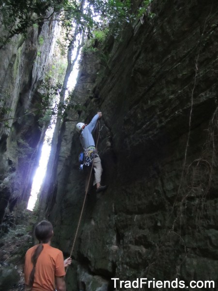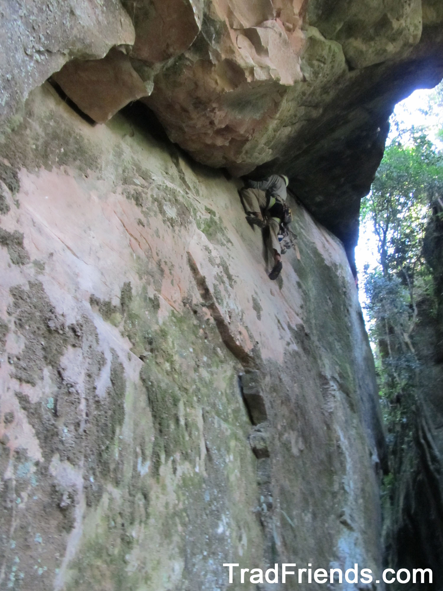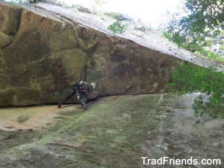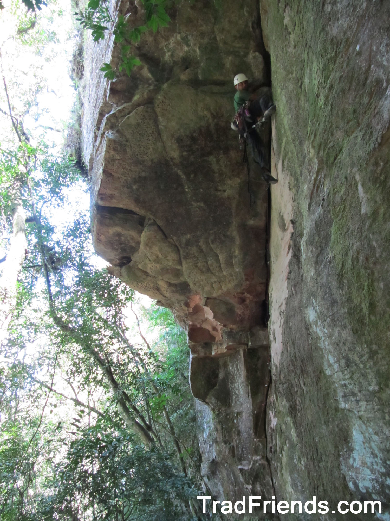 A linha segue uma belíssima fenda em arco para a direita, protegida em móvel integral, de movimentação constante e dura. Todos os movimentos já foram livrados, e agora aguarda mais repetições e uma cadena para confirmação do grau, que estimamos em 8c.