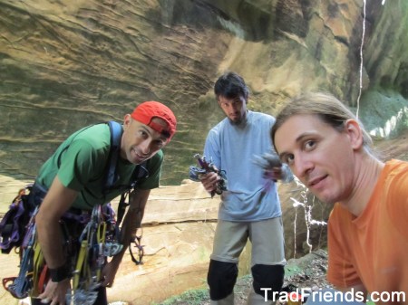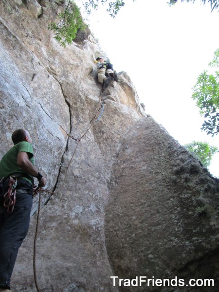 Depois de muito trabalho na abertura da “Arco de Buhl”, e no projeto em frente,  resolvemos repetir outra via já aberta no setor por um pessoal de Joinville, que também andou por aquelas bandas. Se não me engano a via se chama “Um dos sete”, sendo de proteção mista, pois possui duas chapas na saída. Percebemos a possibilidade de proteção natural, e assim decidimos tentá-la em móvel integral, sem usar as duas chapas da saída. Esta decisão foi possível, e a linha dos vizinhos de SC mostrou-se muito bacana e de movimentação interessante, que com um pouco mais de ousadia é possível ser escalada em móvel integral, vai da opção de cada um.