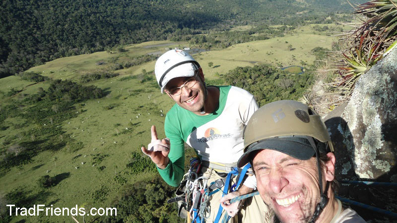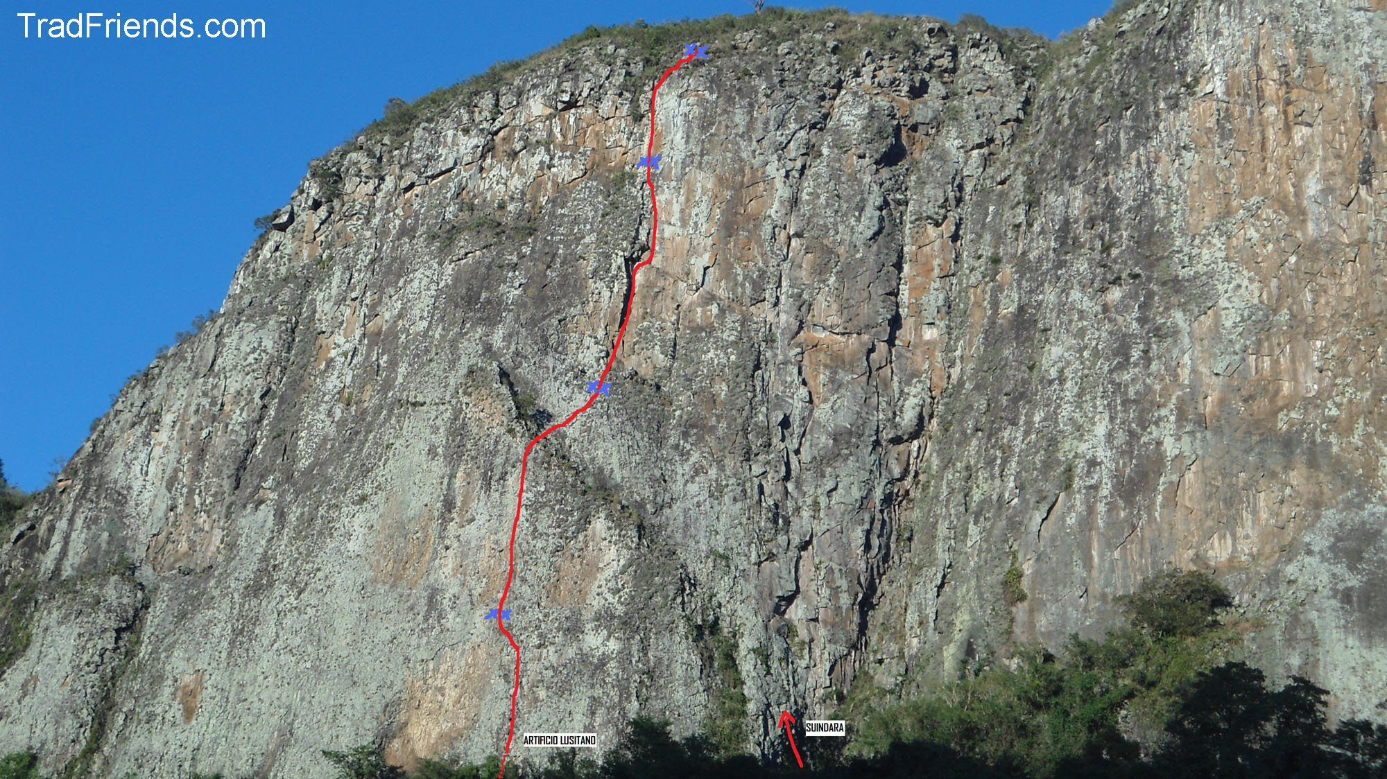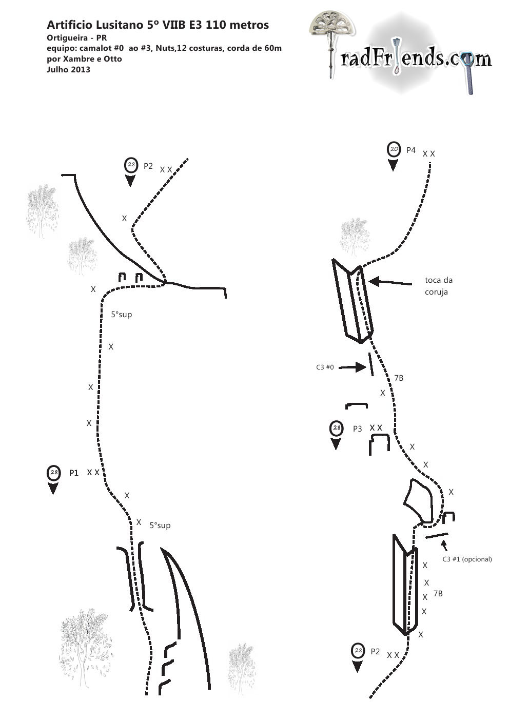 Para quem gosta de via longa de parede e com fácil acesso o Município de Ortigueira localizado no interior do Paraná é uma ótima opção para esses aventureiros. Neste mês de Julho/2013 eu e Adilson Otto “Dilsinho” abrimos mais uma opção de escalada nas paredes de basalto conhecida como Serra Pelada. Trata-se de uma linha com quatro cordadas de graduação moderada e toda em livre. Uma ótima opção de escalada tranquila, sem passar muito perrengue. A via encontra-se no pontão da esquerda do conjunto principal, à esquerda da via “Suindara”. A primeira cordada é mista com apenas duas proteções fixas em seu final e inicia-se em uma “canaleta” com fendas de vários tamanhos com boa opção de proteção móvel de tamanhos variados e de graduação cotada em “5sup”. Já a segunda cordada é inteira fixa, porém, com uma maior distância entre as proteções, cinco no total e de graduação “5sup”. A terceira cordada também é inteira fixa e bem protegida, considerada a mais bonita da via e de graduação cotada em “7b” com oito proteções fixas, podendo optar na saída do diedro em melhorar a proteção com um camalot C3 “1”. A quarta e última cordada é mista com uma única proteção fixa logo na saída da parada onde encontra-se o “crux” também cotado em “7b” seguindo com proteções móveis delicadas em seu começo e melhorando no decorrer da cordada passando por um diedro (totem de pedra) onde encontra-se um ninho de coruja Suindara, seguindo após o diedro para a direita até chegar na parada final onde se pode acessar o cume. É possível rapelar apenas com uma corda de 60m. Para achar a base da via é fácil, é só seguir a trilha beirando a parede e após passar a saída da via “Suindara” descendo a trilha vai encontrar a “canaleta” com algumas pedras fazendo a contenção da base. Deixamos também um croqui plastificado na base da via para facilitar a escalada. Como a via ainda não possui repetições alertamos com o risco de pedras que ainda poderão cair, então muito cuidado! E como o local é propriedade particular do Sr. Osires, pessoa muito gente boa e hospitaleira, reforçamos a mensagem para que os escaladores sejam educados e respeitem os moradores do local para que possamos continuar a freqüentar e usufruir dessas escaladas.