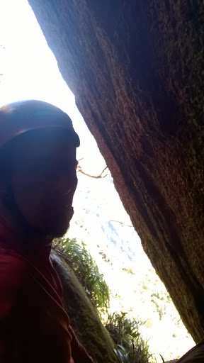 Segui por uma canaleta de mato e, quando percebi a proximidade do fim da parede, segui pela esquerda subindo por uns blocos. Era o fim das dificuldades de escalada, o relógio marcava 11:30 hs, havíamos feito a segunda repetição da via.