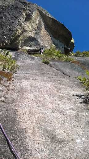 Era hora de eu iniciar a guiada. A próxima enfiada passava por uma canaleta com vegetação, na parte mais vertical havia um tramo difícil de entalamento de mãos. Enquanto escalava uma informação não saía da minha cabeça: era necessário prestar atenção pois, em determinado momento, era preciso sair da sequência de fendas e seguir pela vegetação. Comecei então a seguir para a direita e, como a corda havia terminado, precisamos escalar em simultâneo para chegar a chapeleta, a última proteção fixa da via.