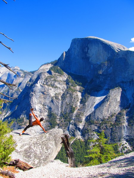Não sei o que tirou mais meu fôlego, se foi somente a altitude ou a beleza indescritível da via. Seguimos escalando em simultâneo por aquela magnífica crista de granito amarelado, onde a sensação aérea era total com abismos vertiginosos em ambos os lados. Meu mantra “inspira, expira, escala” repetiu-se por 2 horas até atingirmos o cume. O visual era espetacular, com um céu azul coroando as diversas montanhas de Tuolumne Meadows e o distinto Half Dome partido ao meio, lá ao fundo.