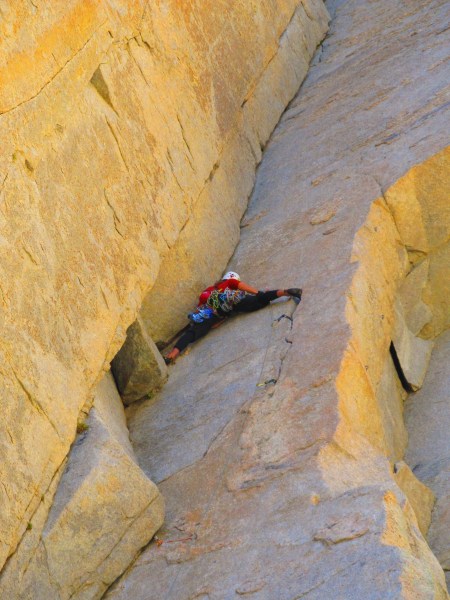 Começamos a aproximação de madrugada, e aos primeiros raios de sol já estávamos na base da parede. Me encarreguei de guiar a primeira enfiada em uma chaminé/offwith relativamente fácil. A segunda enfiada ficou a cargo de Simon, em uma fenda de punhos larga e trabalhosa. Forest puxou a terceira, que seria o crux da via, um offwith duro e extenuante. Grunhiu, gemeu, e passou! Agora a última era minha, em outra chaminé estreita e marota, onde tive a experiência incrível de chegar ao cume por primeiro! Assegurei meus comparsas e a alegria foi geral. Poderíamos passar dias ali em cima, contemplando aquele lugar especial.